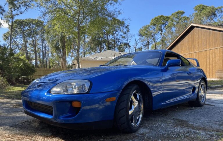 Here’s the scoop: A 388k-Mile 1993 Toyota Supra Turbo Hardtop 6-Speed is currently (Thursday night in NY) at a bid of $48,750. This isn’t your average Supra; it’s a rolling piece of ’90s nostalgia, decked out in a fresh coat of blue paint, sporting ivory leather upholstery, and sitting on chrome 17″ alloys. It’s loaded with upgrades like the HKS Twin Power Ignition Module, an aftermarket blow-off valve, intercooler, and a Greddy cat-back exhaust system, to name a few.