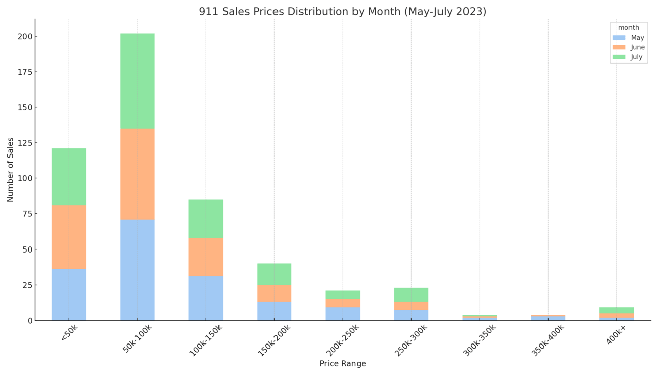 Here's a breakdown of the sales in monetary terms. Examine the chart below to discern any monthly trends or patterns in pricing that you can see. Immediately to me that sales between $50k-$100k are where most of the transactions took place and those amount of sale look pretty equal for the months of May-July.