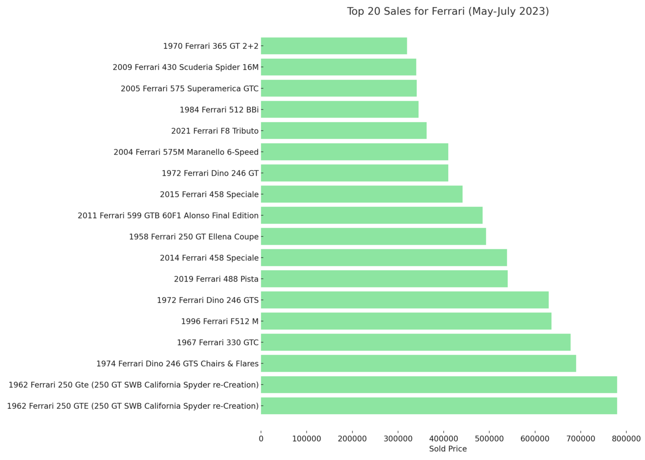 BaT average over 50 Ferrari sales per month. Below I’ve highlighted to the top 20.