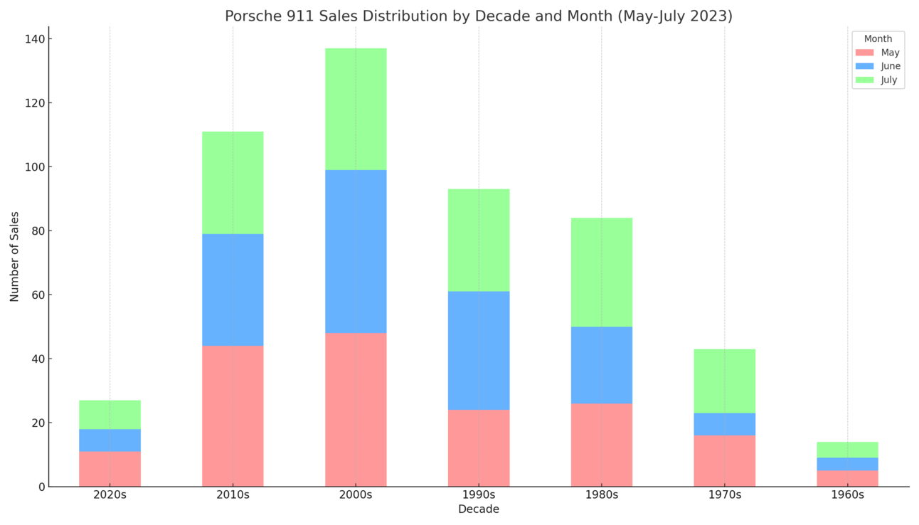 Movers and Shakers: A notable shoutout to the Mercedes-Benz SL-Class with a large growing number of sales. The Ford Mustang also galloped its way with 150+ sales. On the other hand, the Mazda RX-7, while iconic, seemed to have a quieter footprint with 22 sales.