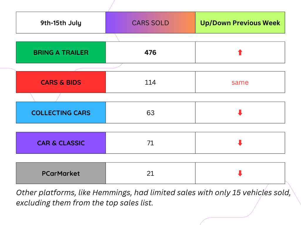 Based on the numbers and the vehicles currently up for auction this week, it's reasonable to expect an uptick in sales this week. The combination of active listings and the potential buyer interest they generate indicates a positive trend in the market. As always, it will be intriguing to see how the auctions unfold and if the increased activity translates into higher sales figures.
