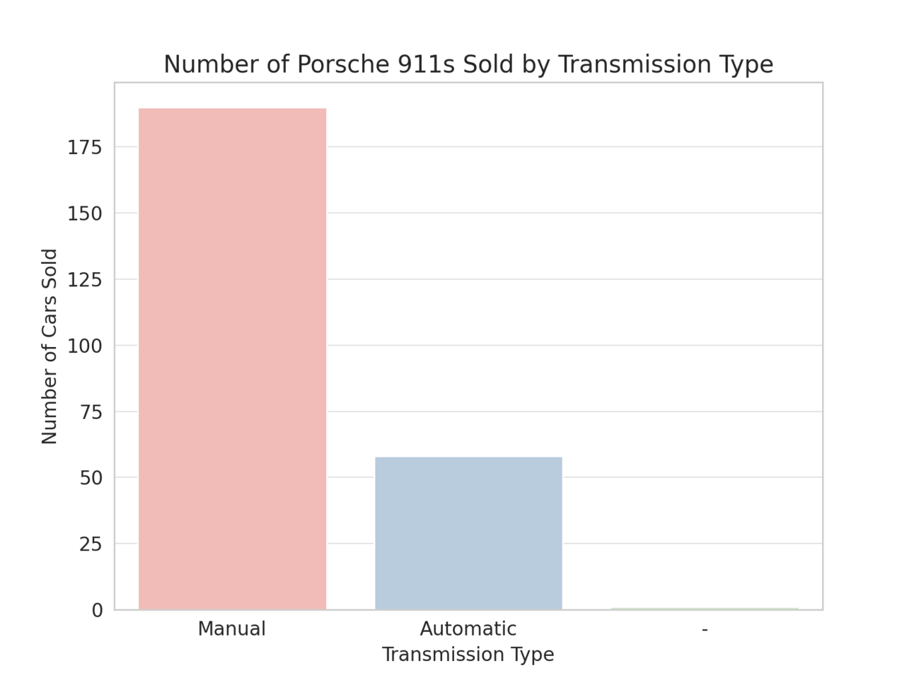 While I initially considered breaking down the transmission preferences further by platform, it turns out that PCarMarket was the only site where automatic transmissions outsold manuals. This insight highlights the unique buying behavior of PCarMarket's clientele, who might have different preferences or requirements when it comes to transmission choices.