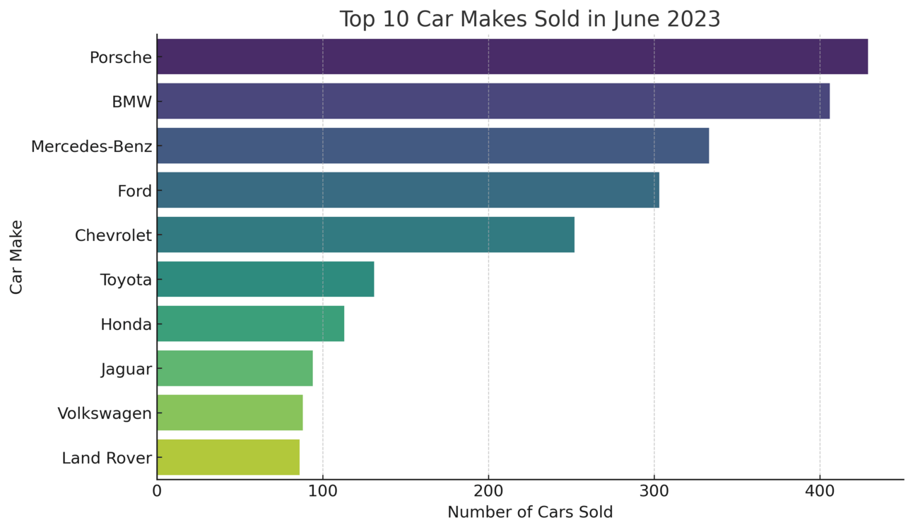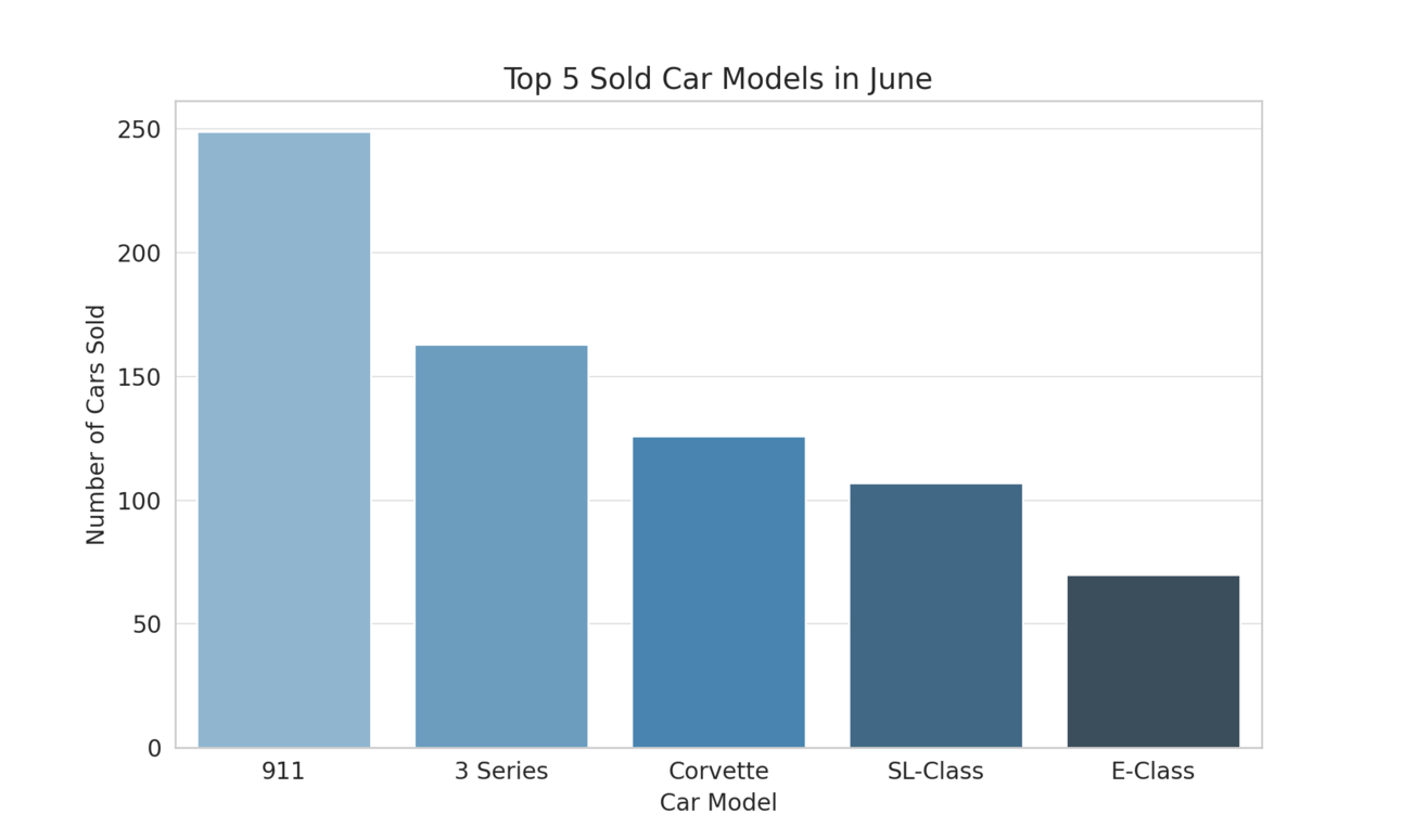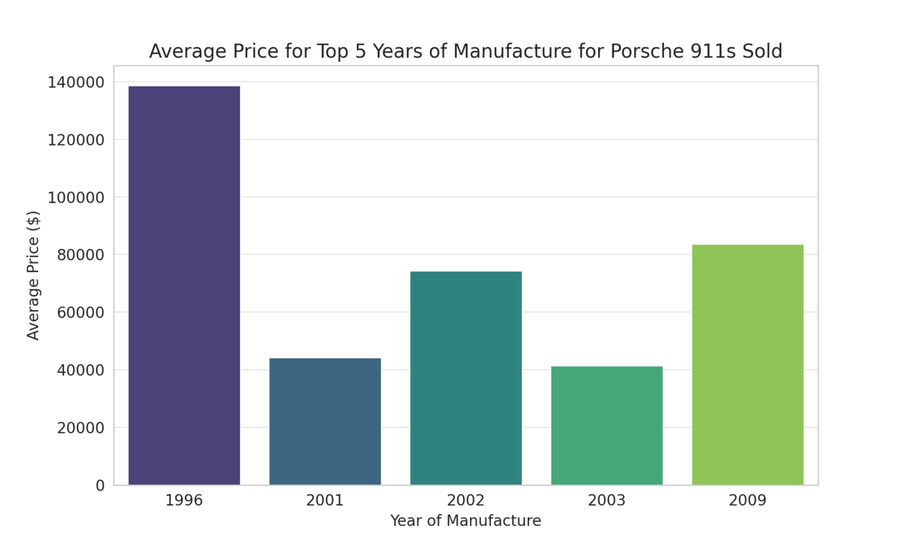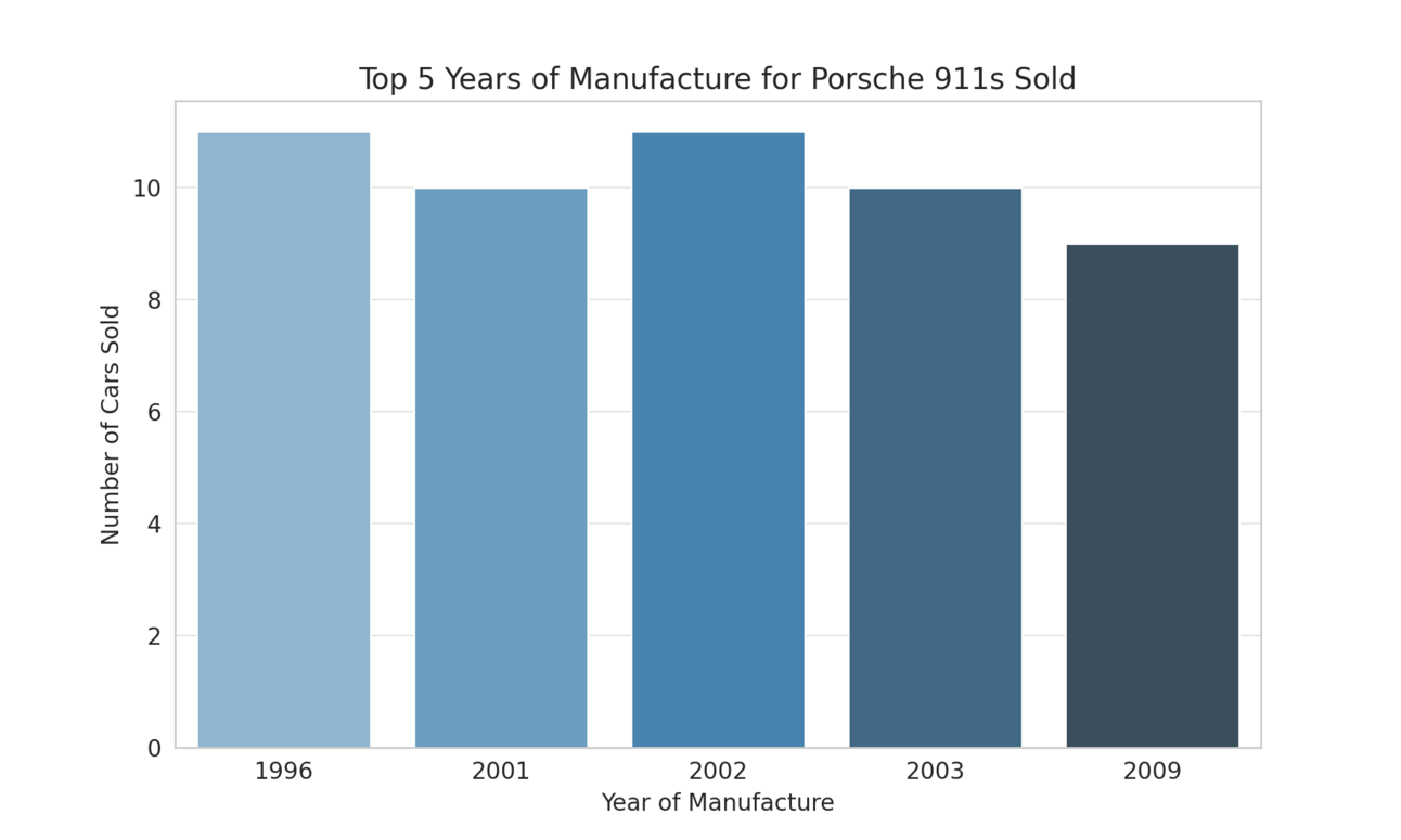 Let's begin by exploring the top 5 years of manufacture for the Porsche 911 models sold in June. Among these sales, the years 1996 and 2002 emerged as the most popular choices. This insight gives us a glimpse into the preferences of buyers and sheds light on the enduring appeal of these particular model years.