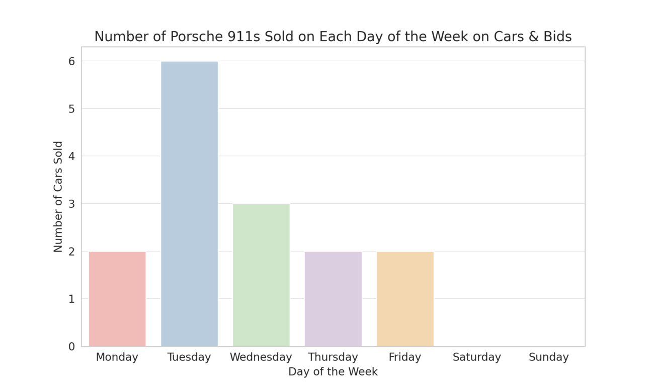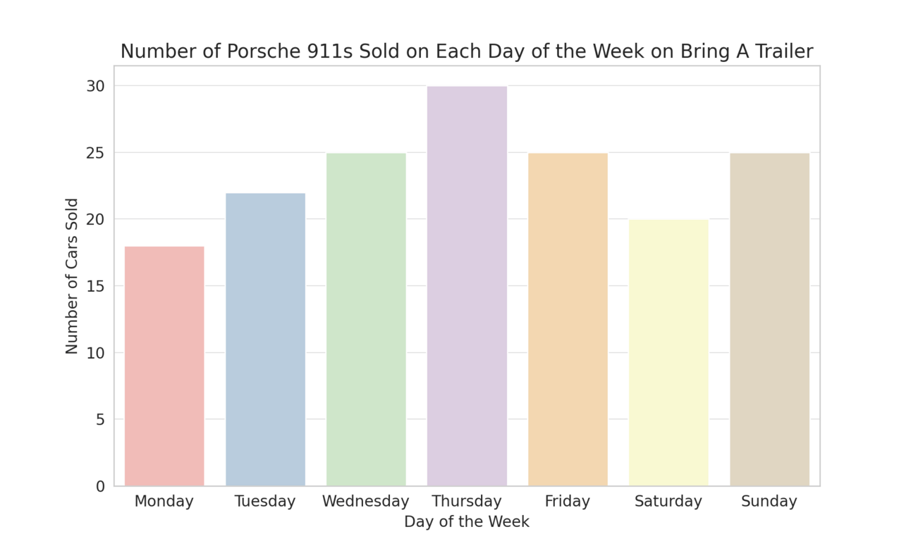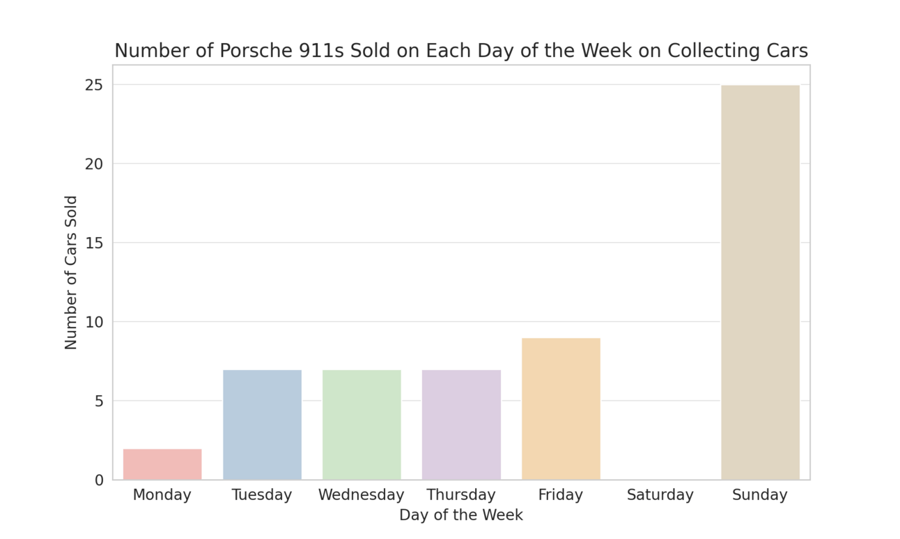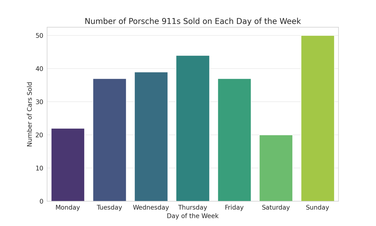 Here's an intriguing statistic that may surprise you! While we previously observed that Friday was the day with the highest overall vehicle sales, it turns out that Sundays take the lead when it comes to selling Porsche 911s. Yes, you heard it right! Sunday is the most popular day for selling Porsche 911s specifically.