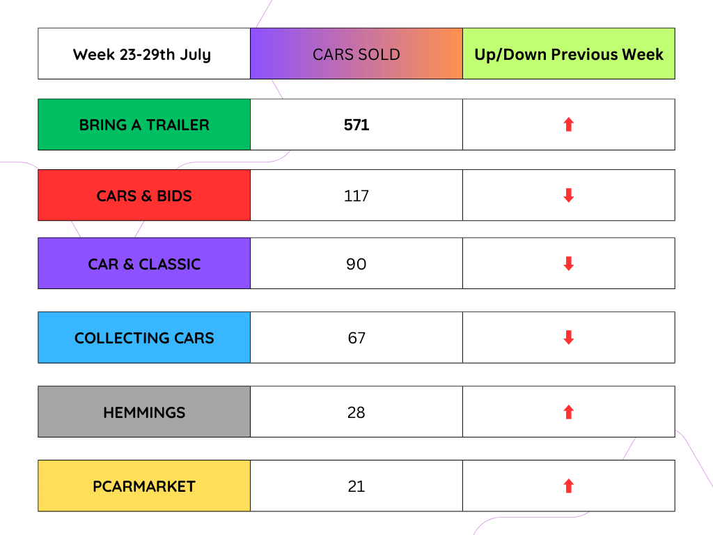 As for the arrows denoting weekly fluctuations, give them a miss except for Bring A Trailer. Other sites on the list either nudged their sales count by one or two units more or less than the previous week, essentially maintaining a steady pace. Bring A Trailer, however, is painting a different picture with week-on-week leaps in sales in July: 452 in week one, 476 in week two, 507 in week three, and a significant jump to 571 this week. I foresee the coming week setting a record-breaking 600 sales!