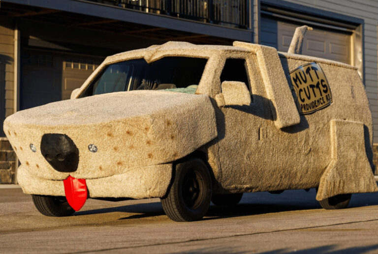 Featuring a unique brown carpeted wrap, this van screams nostalgia. Inside, it's just as iconic, with a carpeted dashboard, fuzzy steering wheel cover, and even a bird cage with a faux dead bird! 🐦 And for the true fans? A replica of the mini-bike from the movie is included. 🛵